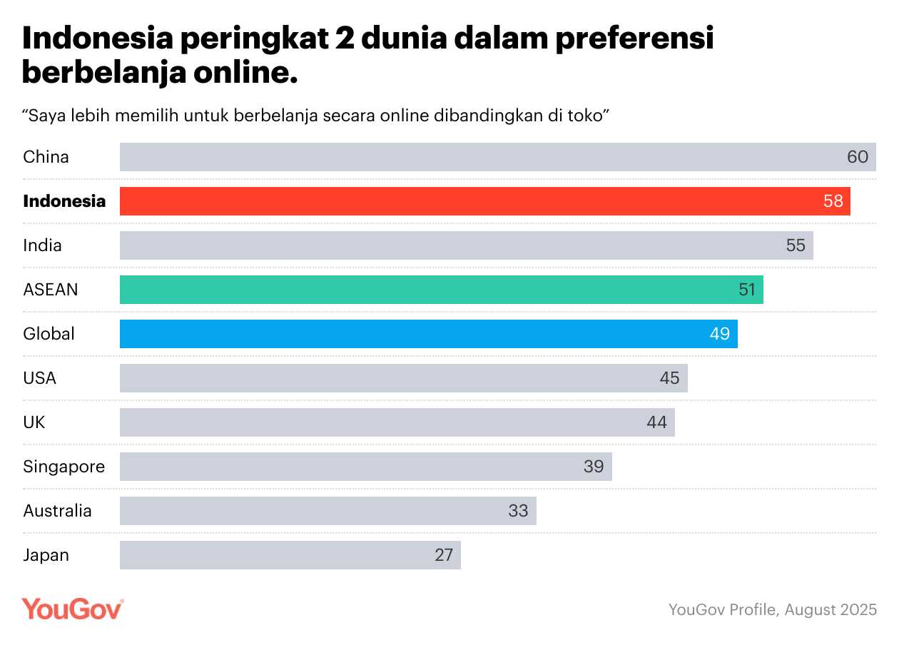 Indonesia menegaskan posisinya sebagai salah satu pasar e-commerce paling dinamis di dunia. Riset terbaru YouGov mengungkap bahwa Indonesia kini berada di peringkat kedua dari 55 pasar global, hanya di bawah Tiongkok dan di atas India dalam hal preferensi belanja online dibandingkan toko fisik.